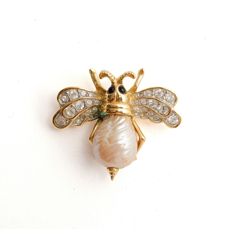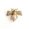 Spilla "Ape" con montatura in metallo dorato, corpo realizzato con perla sintetica scaramazza, ali con pavè di diamanti con caratura a degradare sintetici taglio brillante. Marchio di produzione.