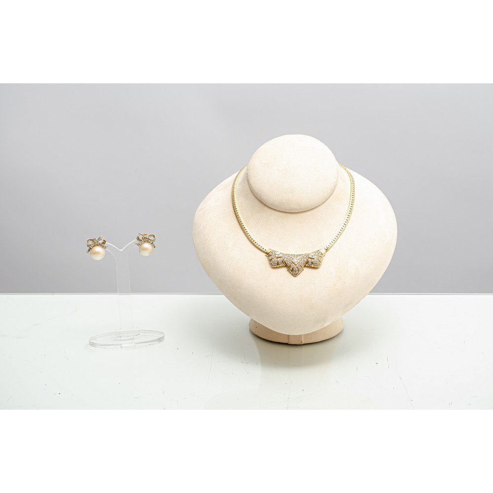 Collana con maglia in metallo dorato, centrale a decoro geometrico con diamanti sintetici taglio brillante, tre pietre più grandi taglio smeraldo. Marchio di produzione. Orecchini con montatura in metallo dorato, perla mabè, decoro a fiocco in diamanti sintetici.