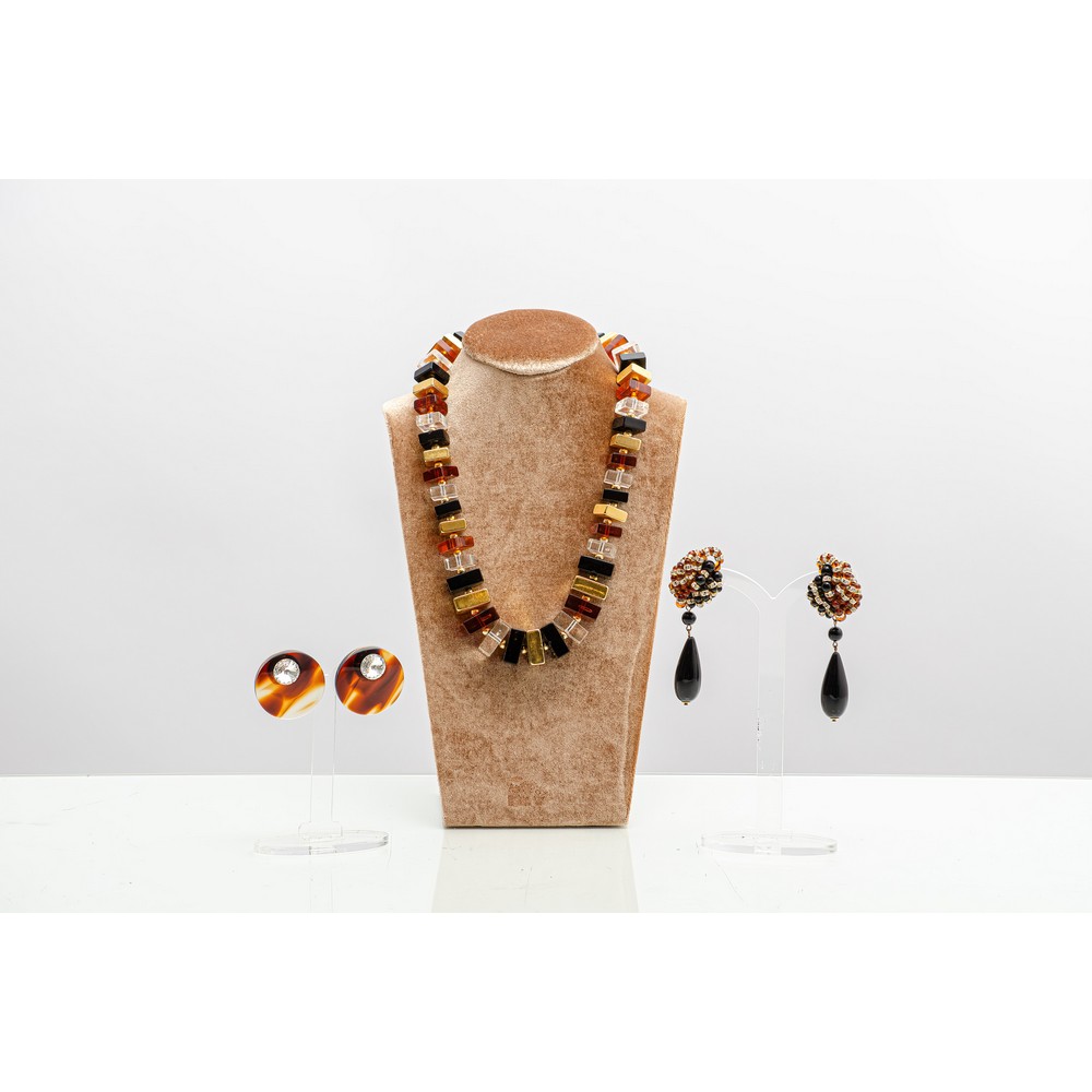Collana a degradare composta da elementi quadrati in bachelite e lucite nero, oro, ambra e trasparente, separatori sferici in metallo dorato, chiusura dorata; orecchini pendenti con struttura in metallo dorato ricoperto da nodo ad incrocio a sfere di resina, ambra e nera, separatori in diamanti sintetici, gocce in resina nera; orecchini a bottoni circolari in lucite a finta tartaruga con grosso strass sulla parte superiore.
