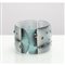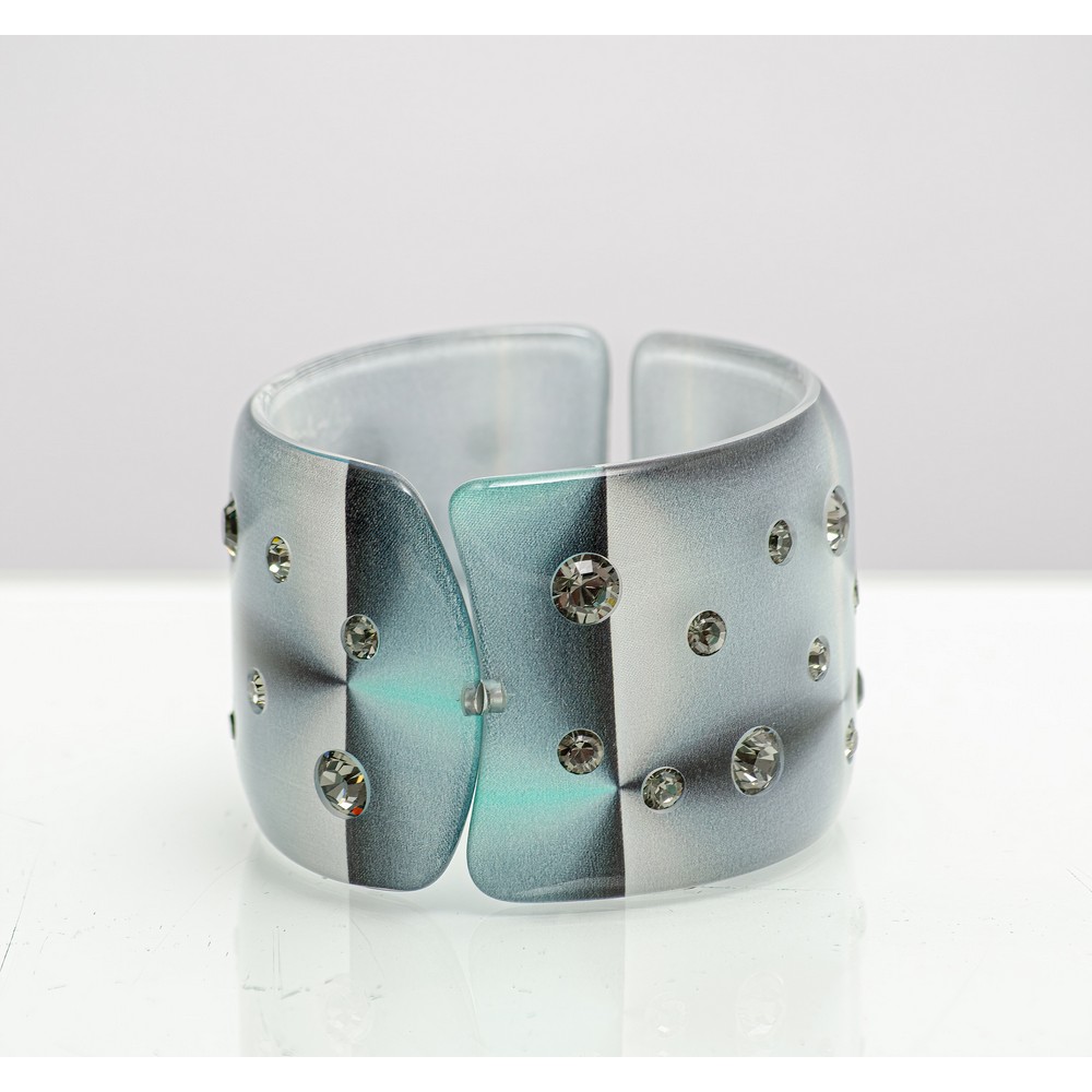 Bracciale rigido in lucite grigia e verde, decori e lumeggiature a sfumare geometriche, strass di caratura differente, chiusura a molla, firma incussa.