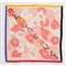 Foulard in seta con decori a foglie rosa e bianche, bordo viola, rosso, nero e giallo. Marchio di produzione.