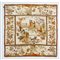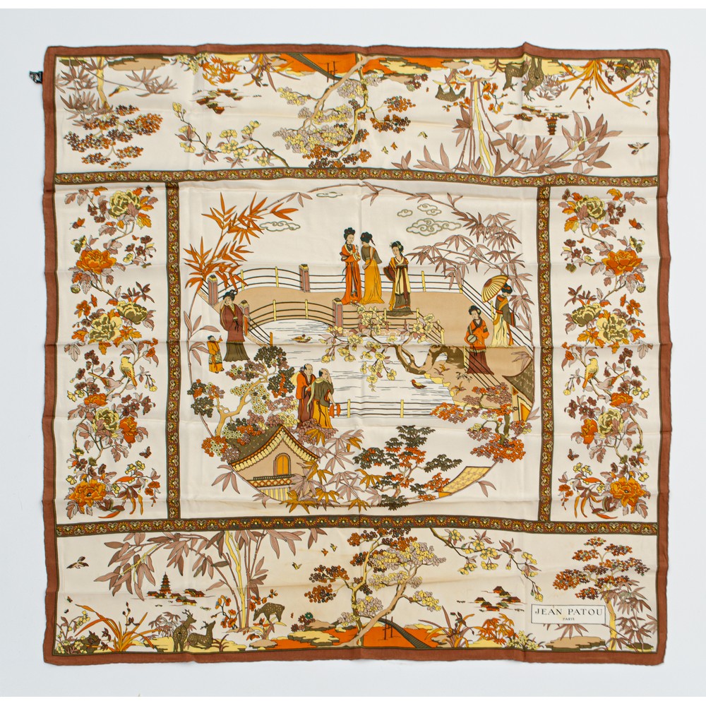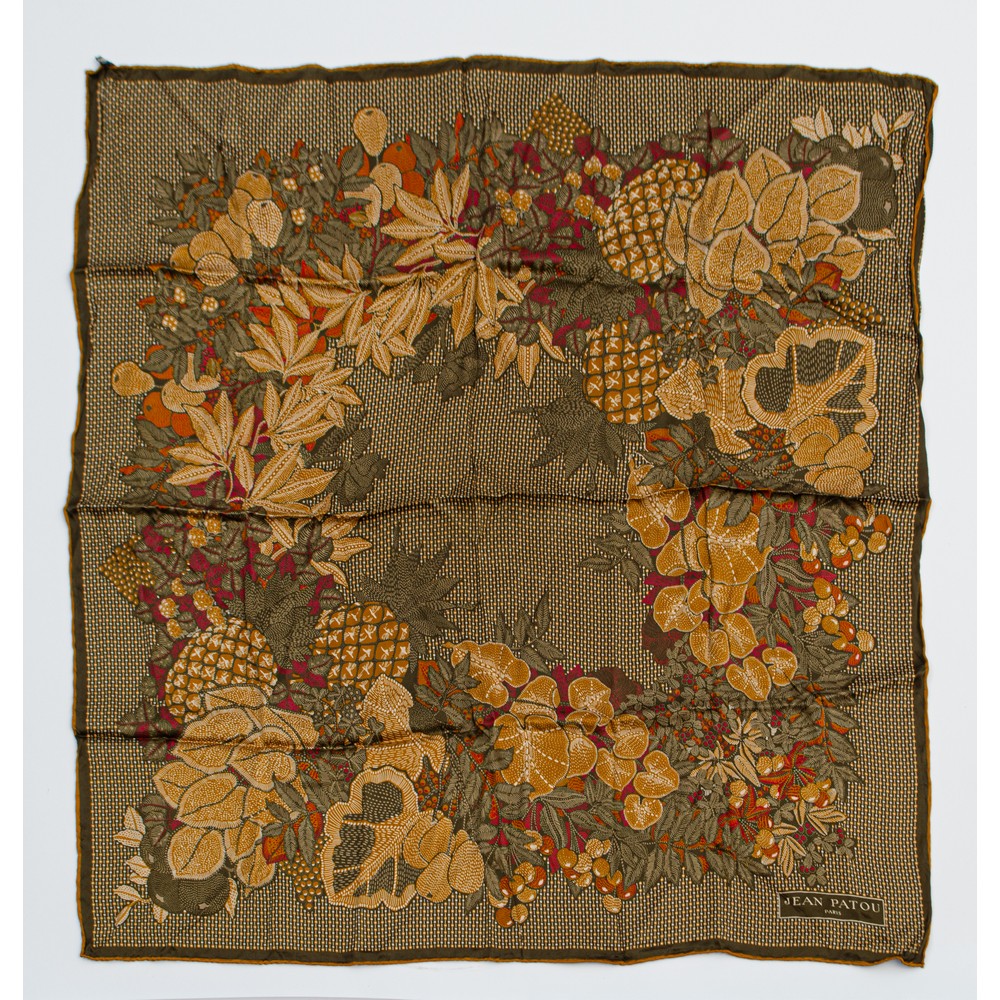 Foulard in seta verde con motivi di frutti e foglie color senape e rosso; foulard in seta campo bianco, decori orientali di scena di vita di corte, bordi a motivi floreali. Aloni e macchie. Marchio di produzione.