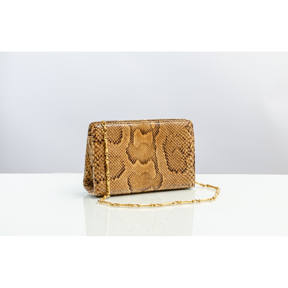 Borsa a spalla in rettile albino, catena in metallo dorato, minuterie in metallo dorato, interno in pelle beige. All'interno tasca aperta e tasca chiusa con cerniera.