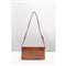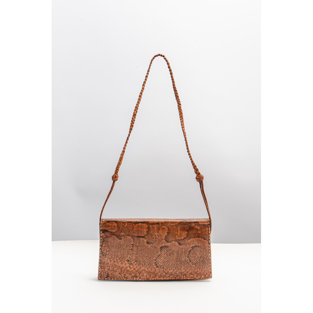 Borsa a spalla in rettile marrone, lavorata a pelli intere, tracolla in fettuccia intrecciata di cuoio. All'interno due scomparti, tasca chiusa con cerniera ed una con elastico, cuoio marrone, cuciture manuali. Lievi segni di uso.