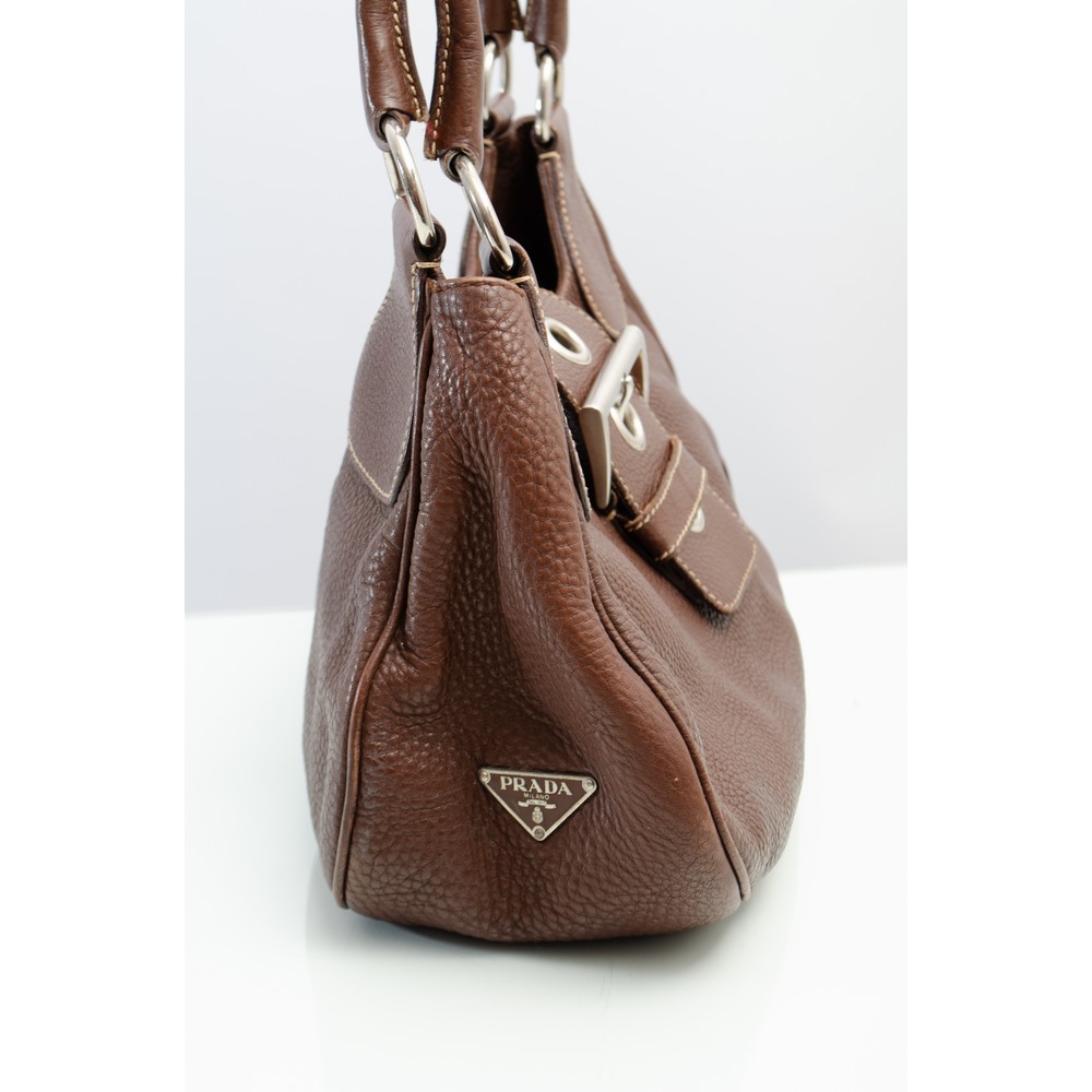 Borsa a spalla in pelle martellata marrone, chiusura con grande fibbia in acciaio spazzolato, minuterie in metallo cromato. All'interno fodera logata marrone, tasca con chiusura a cerniera. Marchio di produzione. Segni di uso.