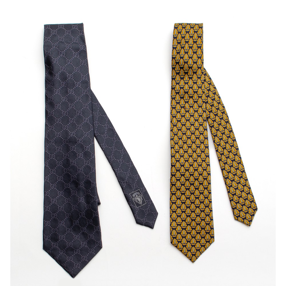 Cravatta in seta nera con decoro monogram, oggetto mai indossato. Etichetta e marchio di produzione. Cravatta in seta blu, decoro a logo Gucci giallo e celeste. Etichetta e marchio di produzione.