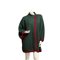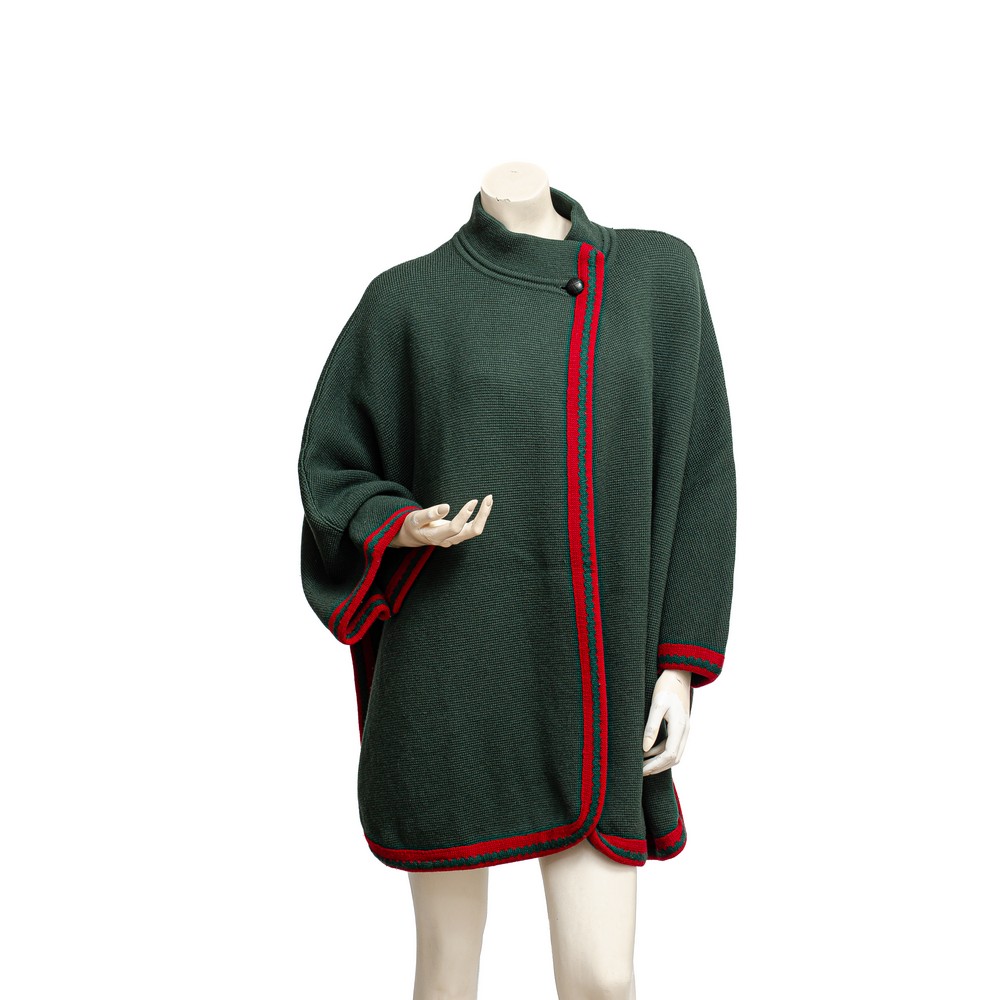 Mantella in lana verde con bordura a righe rosse e verdi, bottone di chiusura al collo in cuoio nero. Etichetta di produzione. Taglia unica.