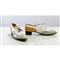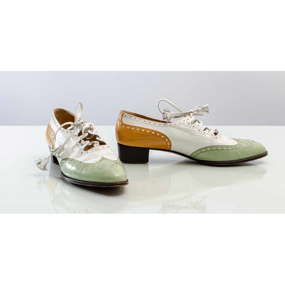Scarpe stringate da donna modello "Richelieu" in vitello bianco, verde pistacchio e senape, decori traforati sui fianchi e sul retro, lacci con nappine. Marchio di produzione. Taglia 39,5.