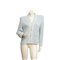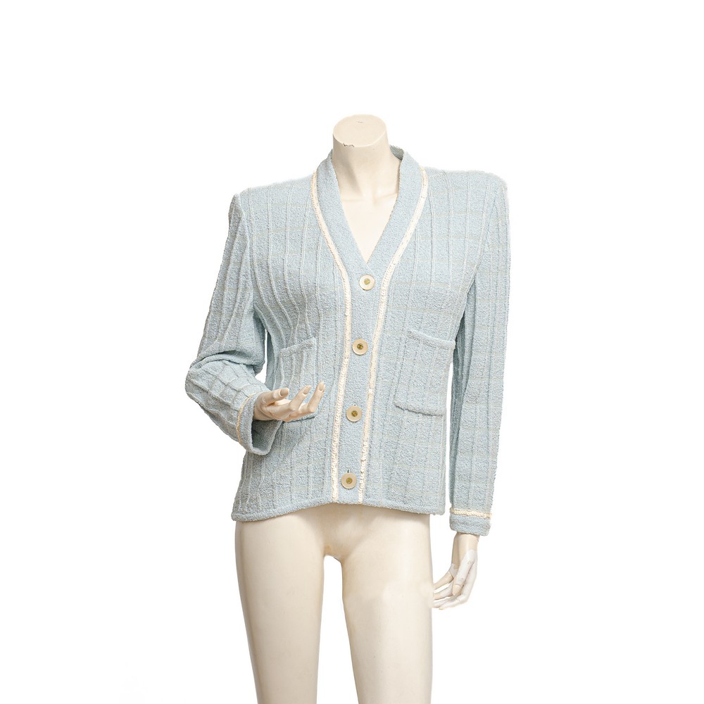 Cardigan in bouclè di misto lana celeste con lavorazione a telaio a rettangoli, maniche lunghe, due tasche sul fronte, collo sciallato e bordato da paillettes avorio opalescenti, chiusura con quattro bottoni logati in madreperla e oro, marchio a rilievo sul fronte. Etichetta non presente. Taglia 44 francese.