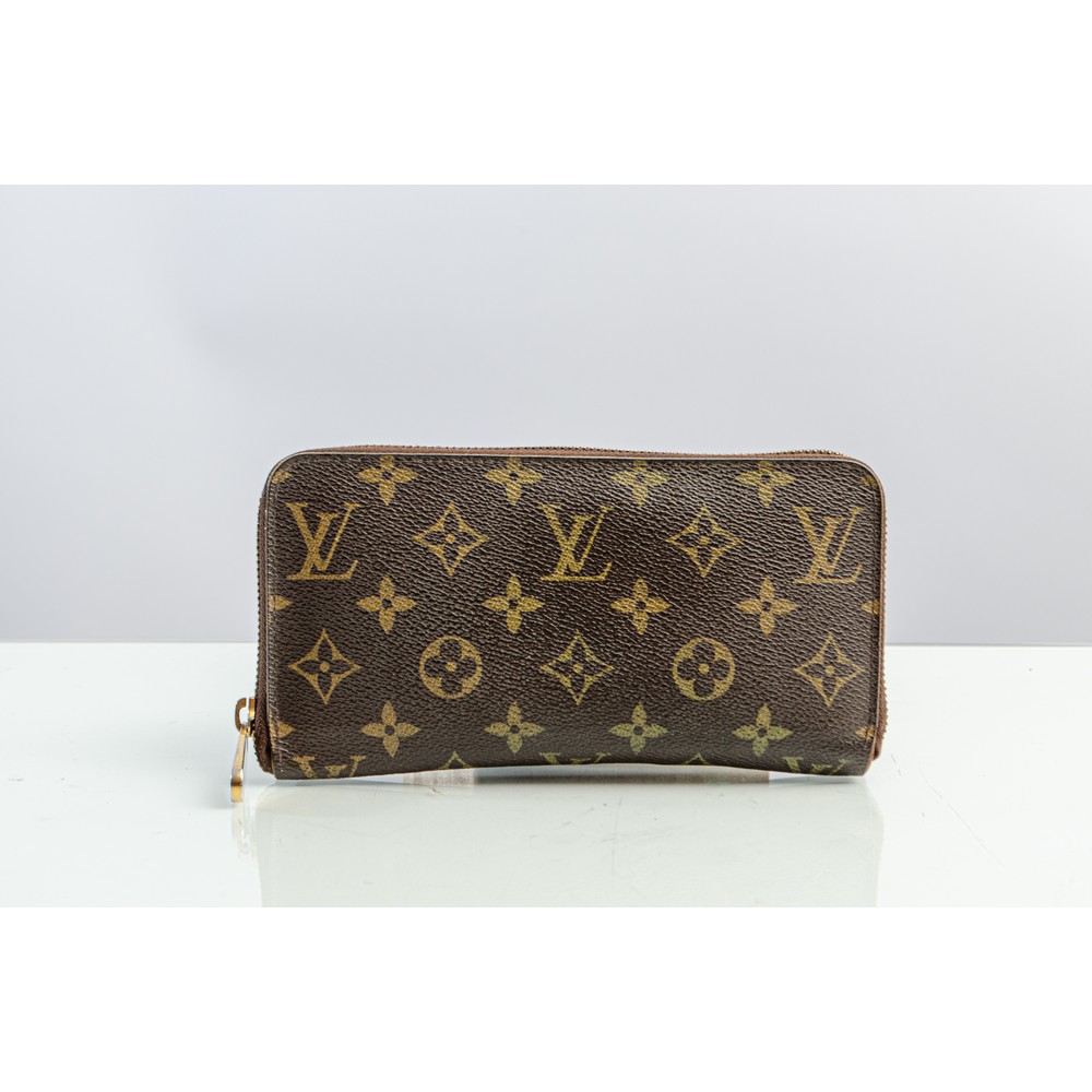 Portafoglio modello “Zippy” in tela Monogram marrone con interno in pelle marrone, chiusura su tre lati con zip in metallo dorato all’interno 12 fessure per carte di credito e ampi scomparti, di cui uno chiuso da cerniera per contenere monete. Marchio di produzione.
