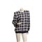 Giacca in bouclè di lana blu con decoro reticolare di quadrati bianchi e bianchi/blu, maniche lunghe, collo a girocollo, chiusura con bottoni sul fronte neri, manica e girovita in tessuto elasticizzato blu. Etichetta di produzione. Taglia 44.