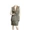 Completo in pelle e camoscio color verde salvia composto da gilet monopetto, collo lievemente sciallato, due tasche frontali, piccola tasca sulla spalla, elastico alla vita; gonna corta al ginocchio taglio retto. Etichetta di produzione.