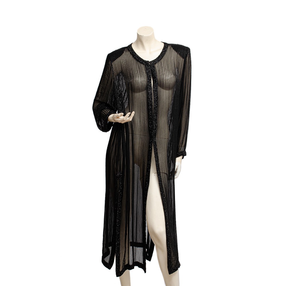 Soprabito in toulle nero decorato con rigature verticali in cannucce nere, collo arrotondato, polsini decorati con ricami in paillettes nere. Taglia M.