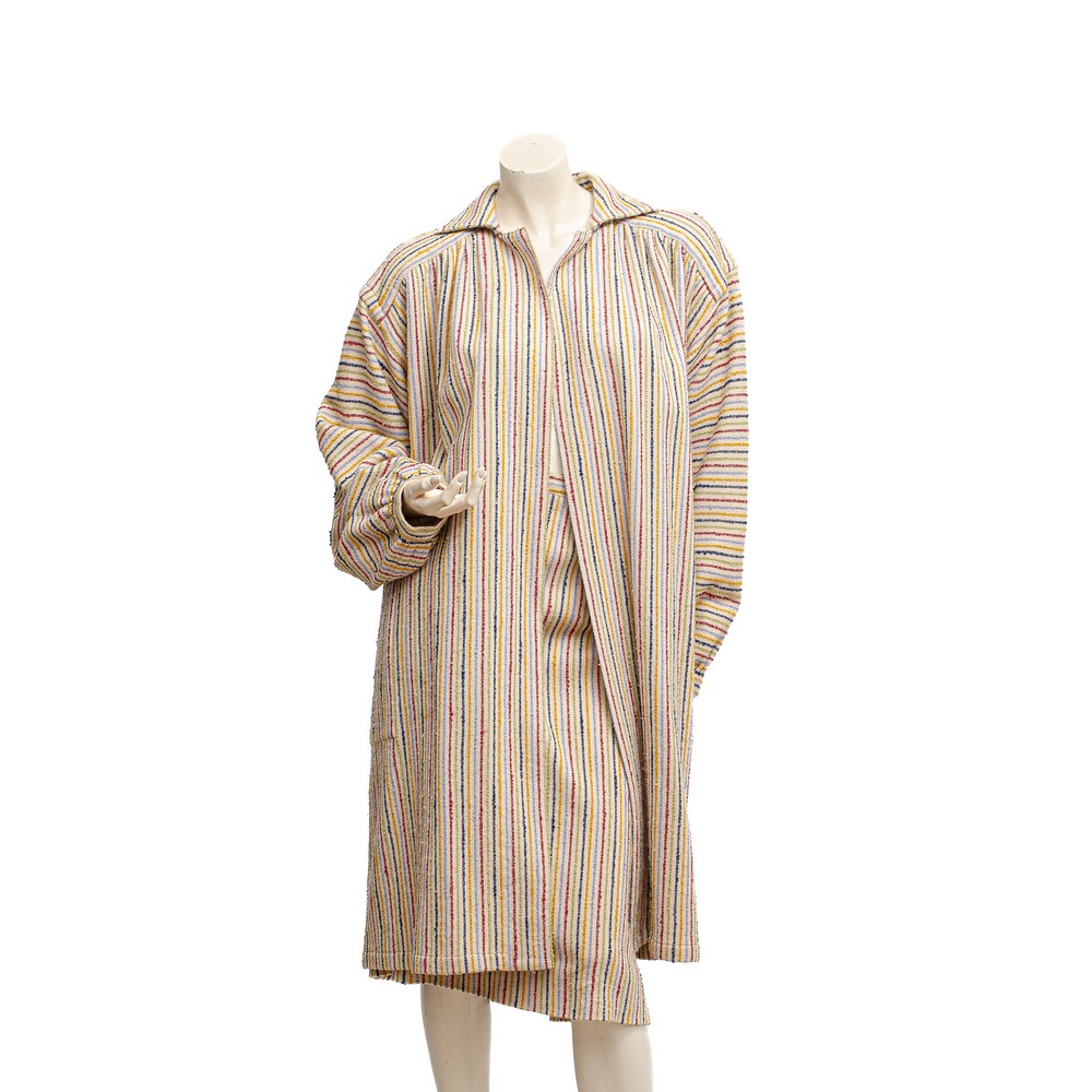 Completo composto da soprabito e gonna in lana avorio decorata con rigature tessute policrome, maniche lunghe, aperta sul davanti, collo francese. Etichetta di produzione. Taglia M.