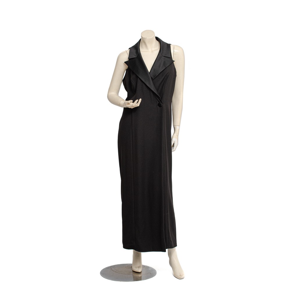 Abito lungo doppio petto smanicato in crêpe di lana, chiusura laterale, bottoni in seta, collo in seta nera. Etichetta di produzione. Taglia 44.
