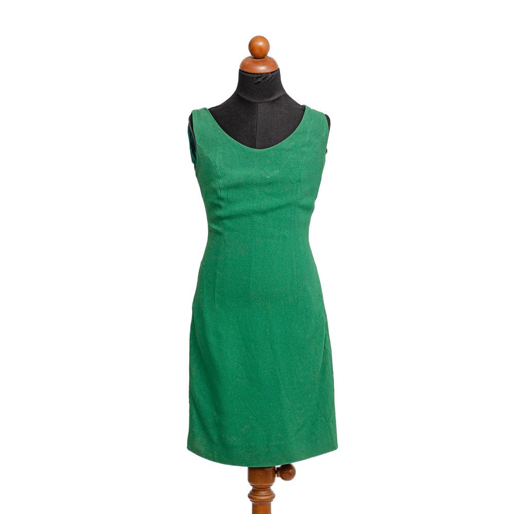 Abito in tessuto rosa, spilla a fiore rosa e crema sul petto, chiusura con cerniera posteriore, piccolo segno di scoloritura. Taglia 40. Etichetta di produzione. Abito in crêpe de chine verde smeraldo. Etichetta di produzione. Segni di uso. Taglia 40.