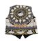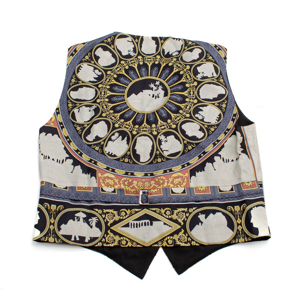 Gilet in seta nera con decori neoclassici grigio, bianco, giallo oro e marrone, bottoni in madreperla. Etichetta di produzione. Taglia 46.