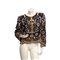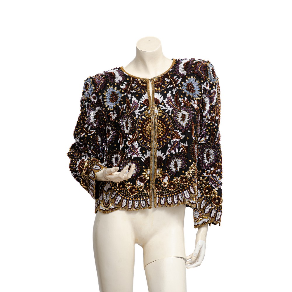 Giacca corta in seta nera con preziosi ricami in cannucce dorate, perline dorate e preziosi ricami manuali a motivo floreale nei toni oro, celeste, lilla, marrone. Maniche con finiture ondulate. Etichetta di produzione. Taglia M.
