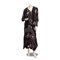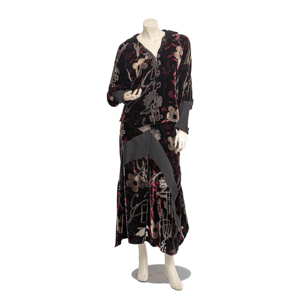 Completo in seta e cachemire nero con decori floreali rossi e tortora composto da camicia, maniche lunghe, polsi in maglia, bottoni sferici bruniti, collo in velluto nero; gonna lunga con fasce di maglia nere.