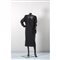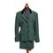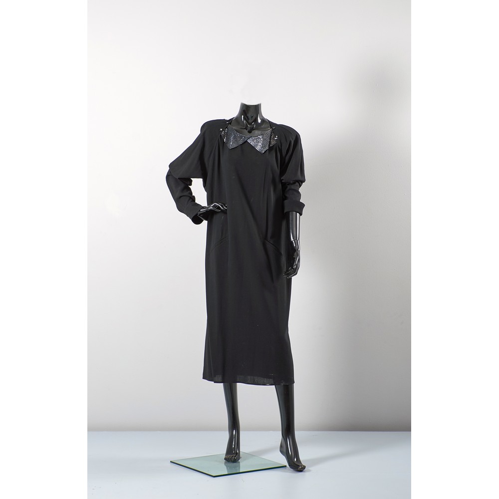 Abito in crêpe di lana e seta nero, due tasche sul fronte, manica a pipistrello, collo ricamato con cannucce in vetro nere metallizzate. Bottoni gioiello con strass. Etichetta di produzione. Taglia 46. Tailleur in lana verde, giacca tre bottoni con due tasche sul fronte, spacco centrale posteriore, collo e bottoni in velluto blu, gonna al ginocchio di taglio retto, fodere in cupro. Segni di uso. Etichetta di produzione. Taglia 40.