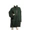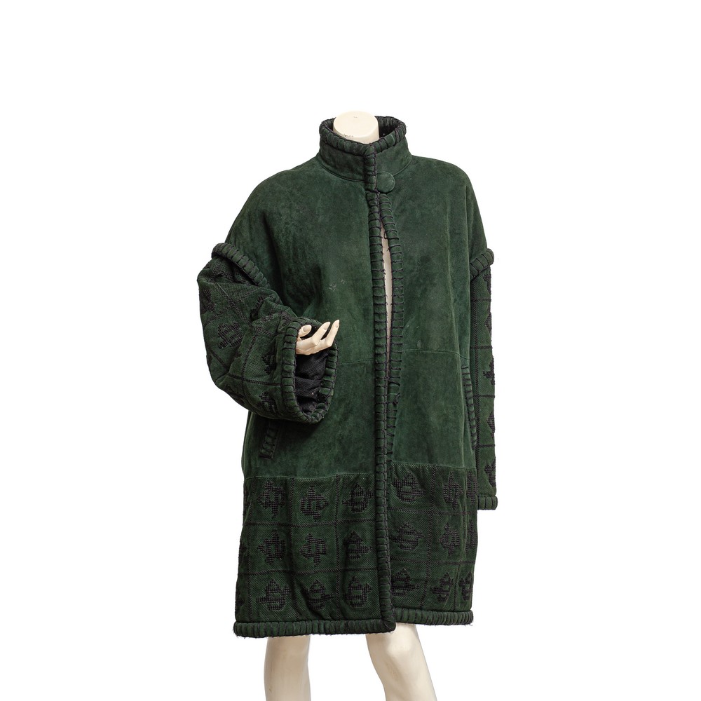 Giaccone in montone verde con maniche e fascia posteriore decorata con ricami neri a punto croce, due tasche verticali laterali, bottone di chiusura al collo, pelliccia interna nera. Segni di uso e macchie. Taglia Oversize.