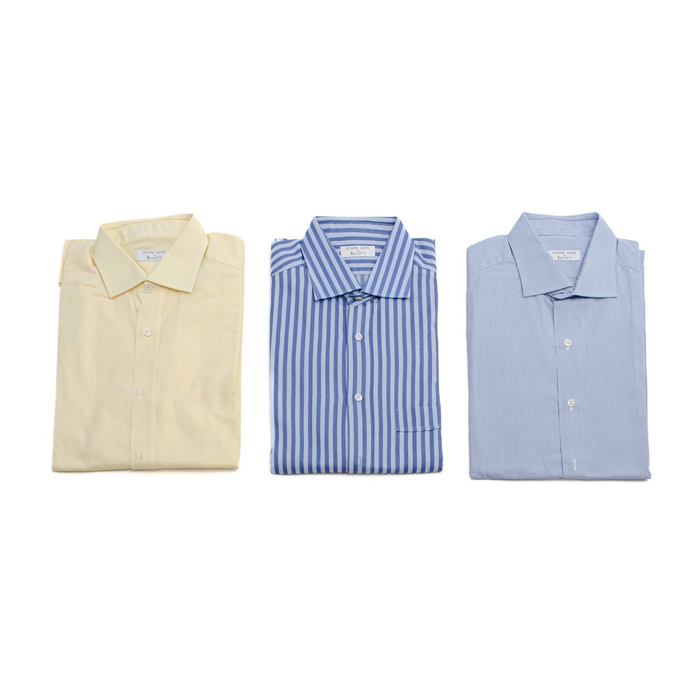 Tre camicie a manica lunga di cui una bacchettata bianco e blu, una bacchettata bianco e celeste ed una gialla. Etichetta di produzione. Taglia 40-41.