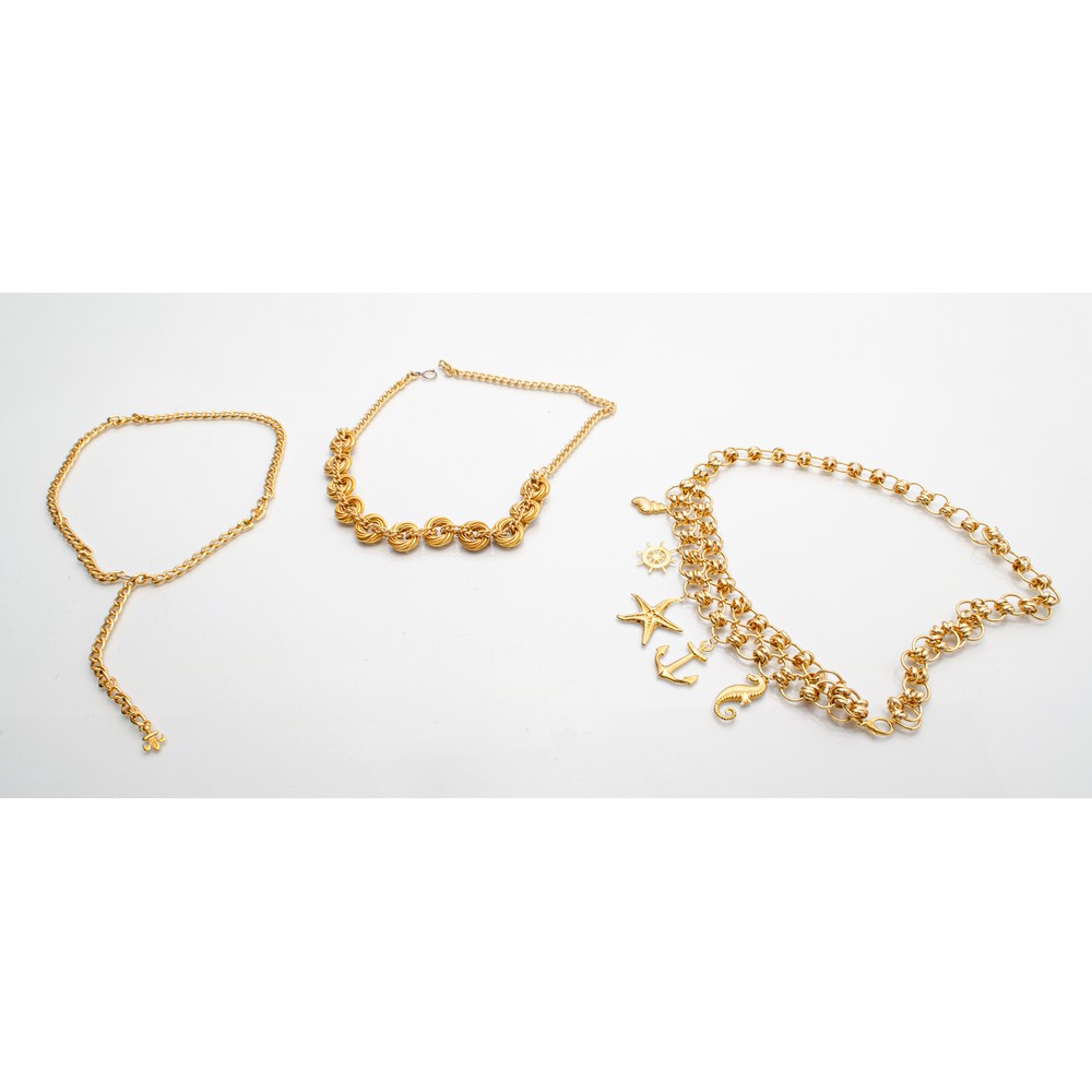 Cintura in metallo dorato, grossa catena, charms a motivo marinaro, chiusura a gancio; cintura in metallo dorato, catena sabbiata, parte centrale con decori circolari forati in metallo dorato lucido; cintura in metallo dorato, maglia a catena, chiusura a gancio, terminale con motivo a giglio fiorentino.