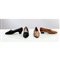 Mocassino da donna in vitello marrone, decoro con morsetto e logo in metallo dorato. Marchio di produzione. Taglia 37. Décolletté in velluto di seta nero, scollatura con rouges di seta nera. Marchio di produzione. Taglia 37.