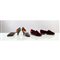 Décolletté in pelle grigia conciata con decori astratti a rilievo, scollatura sagomata. Marchio di produzione. Taglia 37. Friulane in velluto di seta bordeaux, punta quadrata. Marchio di produzione. Taglia 37.
