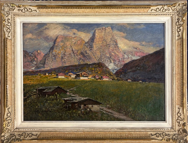 Cesare Bentivoglio Genova 1868 - 1952 Dolomiti, Cimon della Pala, San Martino di Castrozza Olio su tela cm 70x100 firmato in basso a sx