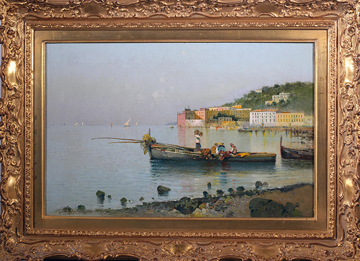 Petruolo Salvatore (Catanzaro 1857 - Napoli 1942) Vita costiera olio su tela, cm 38x57,5 firmato e datato in basso a sinistra: S. Petruolo 1885 a tergo cartiglio “Gall. Il Prisma”, Cuneo Provenienza: Galleria “Il Prisma”, Cuneo; Galleria Giordani, Bologna; Galleria Falanga, Napoli; Galleria Colonna, Napoli; Coll. privata, Napoli. Esposizioni: Napoli, 1992; Napoli, 2017. Bibliografia: D. Di Giacomo (a cura di), Ottocento italiano, Catalogo “Vittoria Colonna” n.2, Esposizione Hotel Excelsior Napoli, Ischia 1992, tav. 20; G.L. Marini, Il valore dei dipinti italiani dell’Ottocento e del primo Novecento, ed. X, Torino 1992 - 1993, seconda pagina inserzioni pubblicitarie a colori; R. Caputo, La Pittura napoletana del II Ottocento, Di Mauro Editore, Sorrento (NA) 2017, p.189.