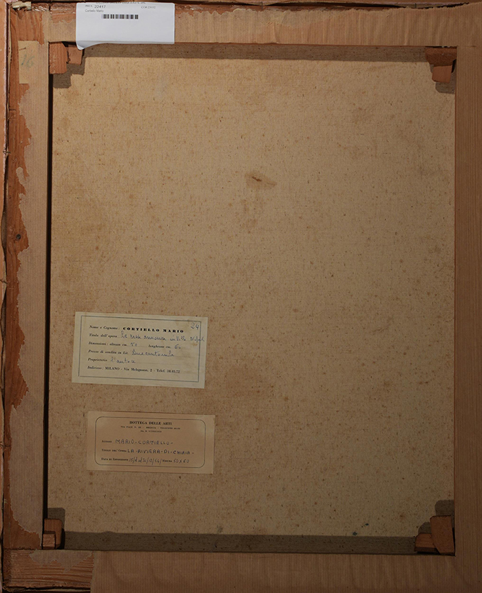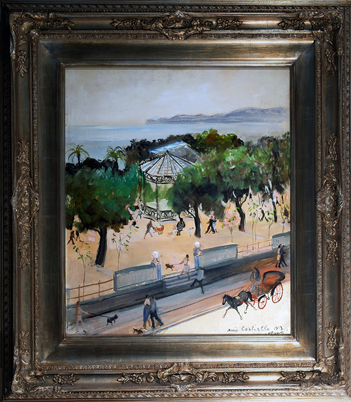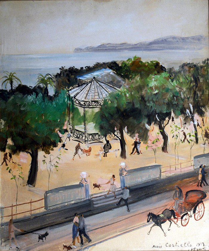 Cortiello Mario (Napoli 1907 - 1981) La cassa armonica in villa, Napoli olio su tela, cm 60x50 firmato, iscritto e datato in basso a destra: Mario Cortiello 1953 Napoli a tergo firmato e dedicato; cartiglio Bottega delle Arti, Brescia dic. 1954; cartiglio dell'artista Milano, Via Melegnano Bibliografia: O. Vergani, Mario Cortiello "Silvana" Editoriale d'arte, Milano, tav. XLI in b\n; Mario Cortiello 1907-1981, a cura di V. Corbi e P. M. Capria, Paparo Ed. Napoli 2007 pag. 105 in b\n