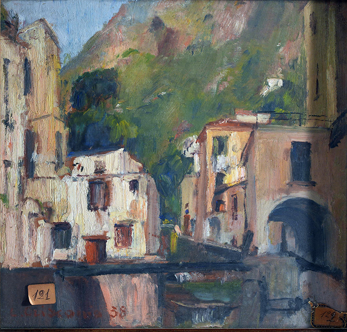 Crisconio Luigi (Napoli 1893 - Portici,NA 1946) Strada di Meta olio su tavola, cm 31x32 firmato in basso a sinistra: L. Crisconio 38