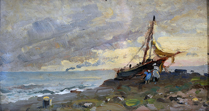 De Corsi Nicolas (Odessa, 1882 - Napoli, 1955) Veliero olio su tavola, cm 11x20,5 firmato in basso al centro: De Corsi