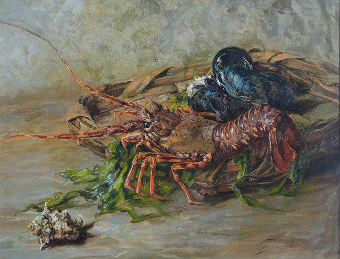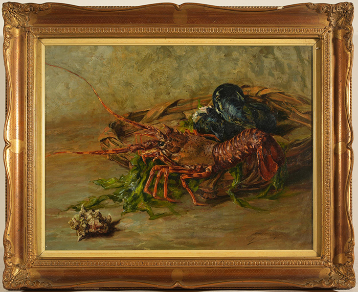 Bottiglieri Gennaro (Napoli 1899 - 1965) Natura morta con aragosta olio su tavola, cm 32x42 firmato in basso a destra: G. Bottiglieri