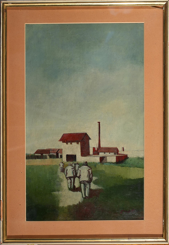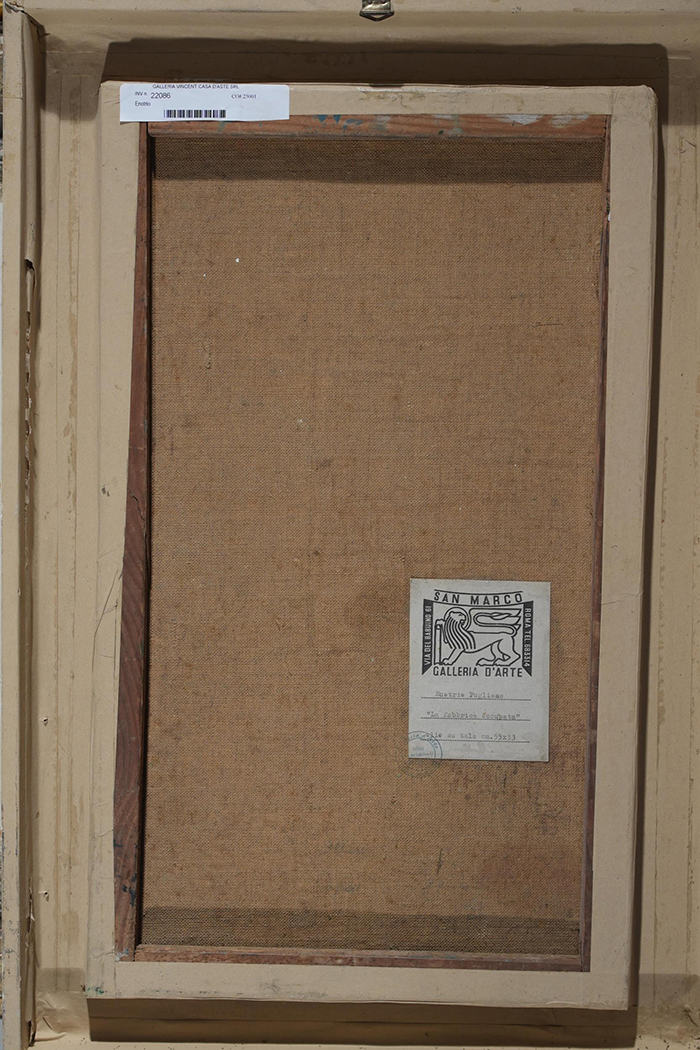 Enotrio (Buenos Aires, 1920 – Pizzo, 1989) La fabbrica occupata olio su tela, cm 55x33 firmato in basso a destra: Enotrio a tergo Cartiglio Galleria d'Arte. San Marco, Roma