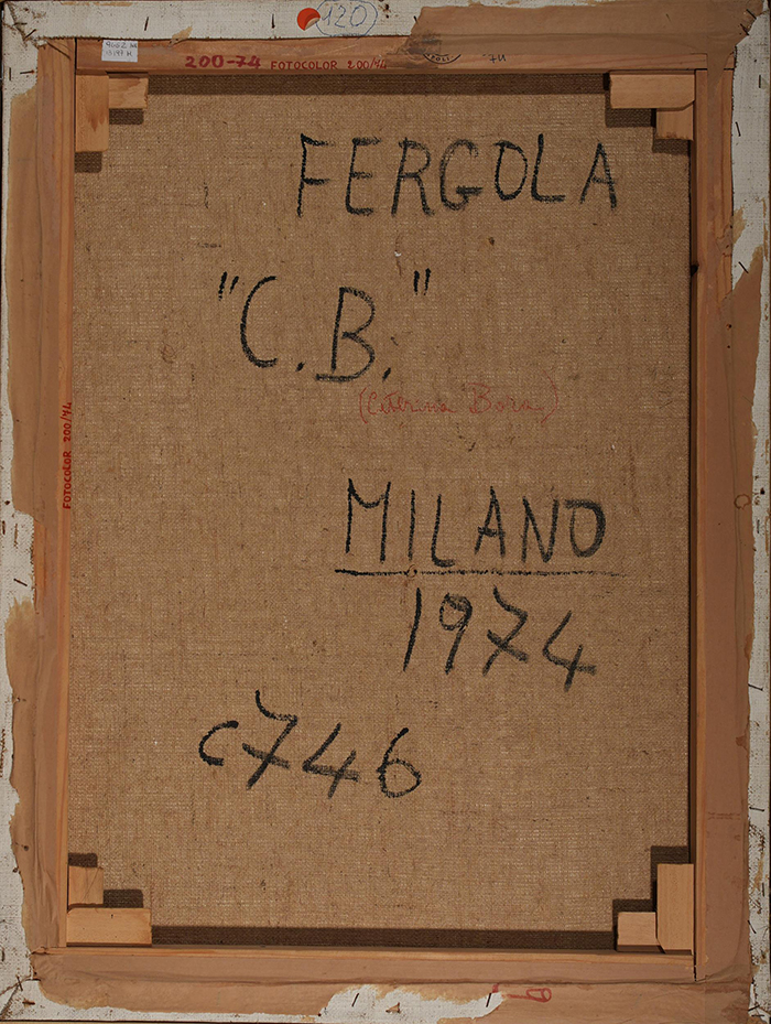 Fergola Sergio (Napoli 1936 - Milano 1994) C.B. (Caterina Bora) acrilico su tela, cm 80x60 firmato in basso a destra: Fergola 74 a tergo: Milano 1974 Bibliografia: Catalogo Galleria Vincent, Sergio Fergola 1936 - 1994, Napoli 2011, pag. 30
