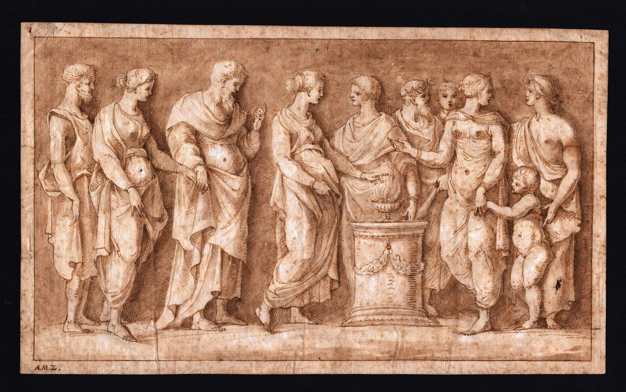 Inchiostro, penna e acquarello su carta vergata cotrofondata, 180 x 302 mm. Monogramma A.M.Z. in basso a sinistra.