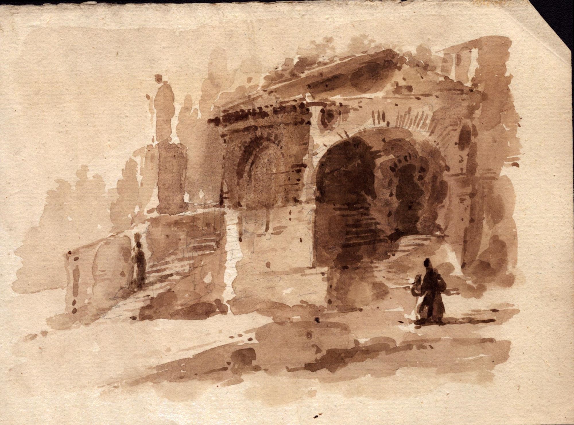 Acquarello bruno con tracce di matita su carta vergata spessa, 135 x 180 mm.