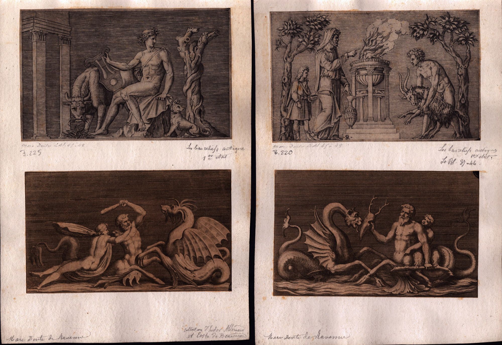 Serie quasi completa, con 7 delle 8 incisioni della serie "Antichi bassorilievi". Bulino, 115 x 180 mm ca. (cad. foglio). 5 esemplari in I stato, prima dell'indirizzo di Salamanca. Bartsch XIV.182.220-227 (manca il 226).