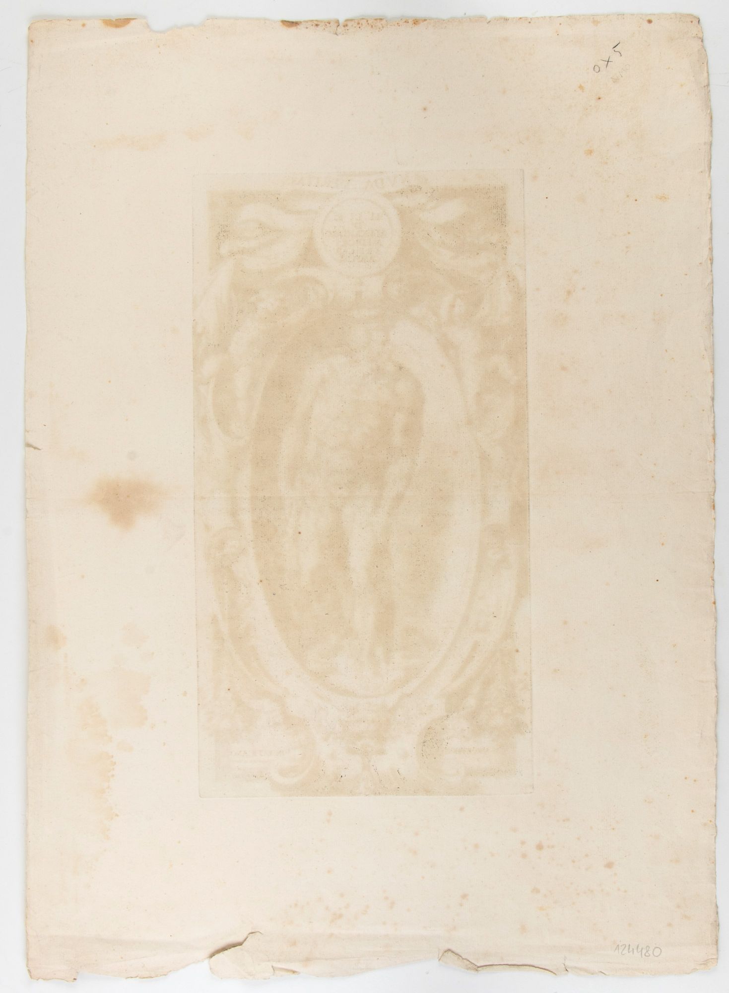 Bella impressione stampata su grande porzione di carta vergata seicentesca. Foglio con traccia di piega centrale orizzontale e alcune leggere macchie. Bordi non uniformi, strappi e pieghe lungo il bordo inferiore, ma nel complesso in ottimo stato.
