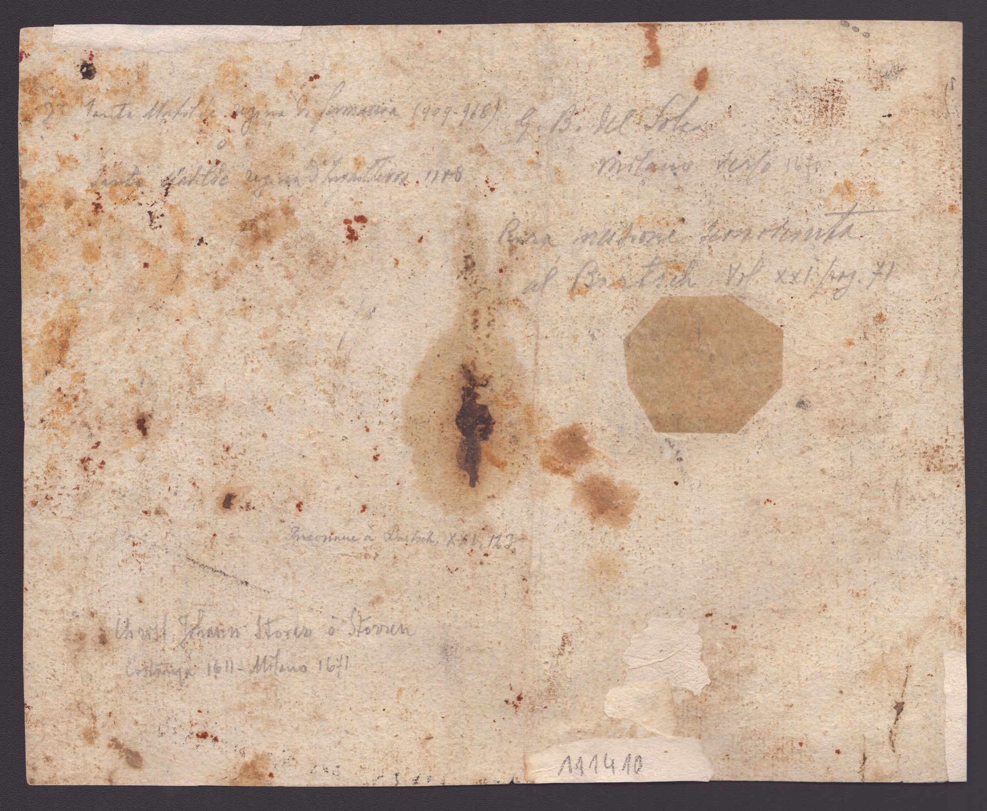 Bella impressione su carta vergata. Foglio rifilato, uniformemente ossidato. Con alcuni strappi, restauri al verso e delle macchie.