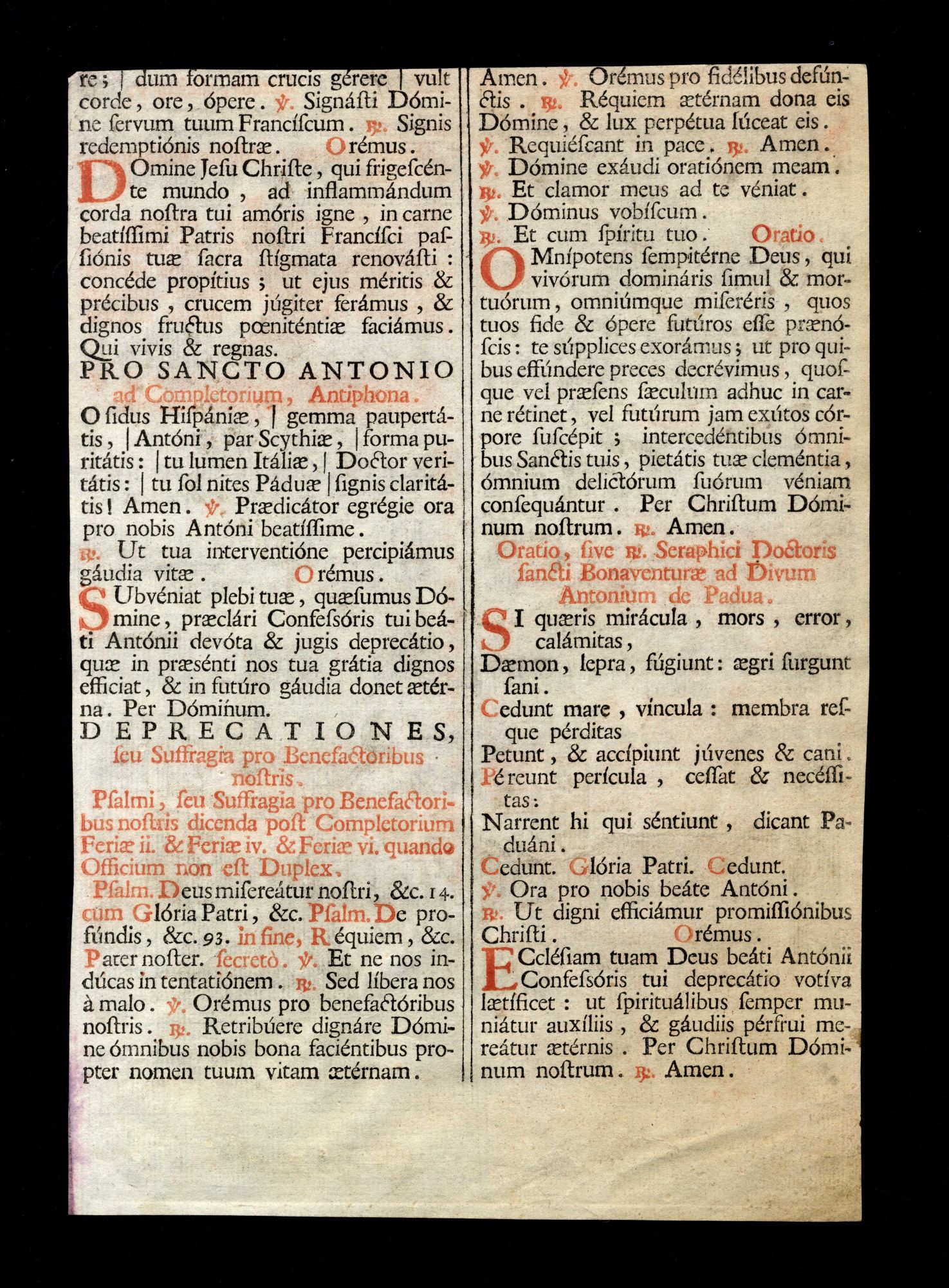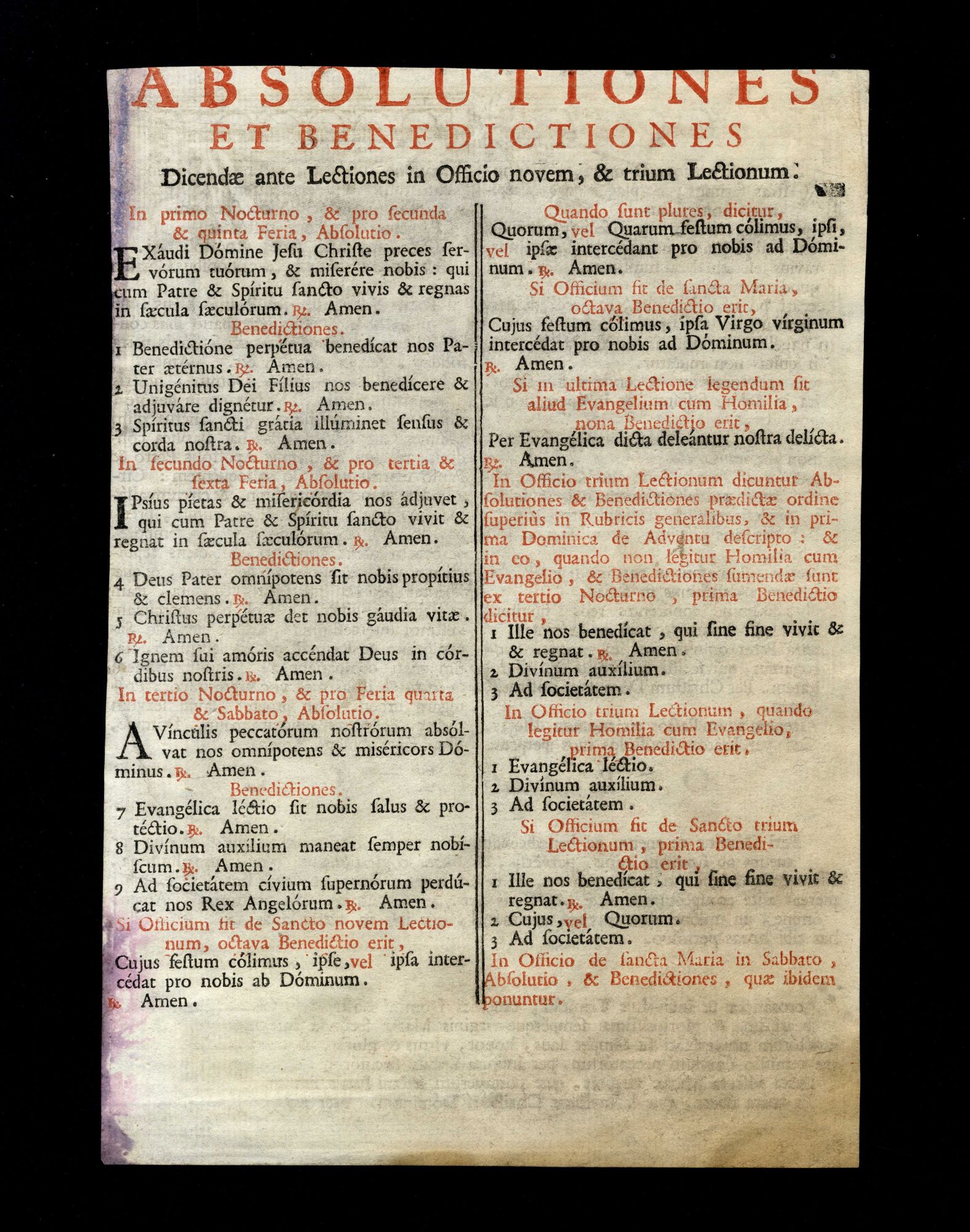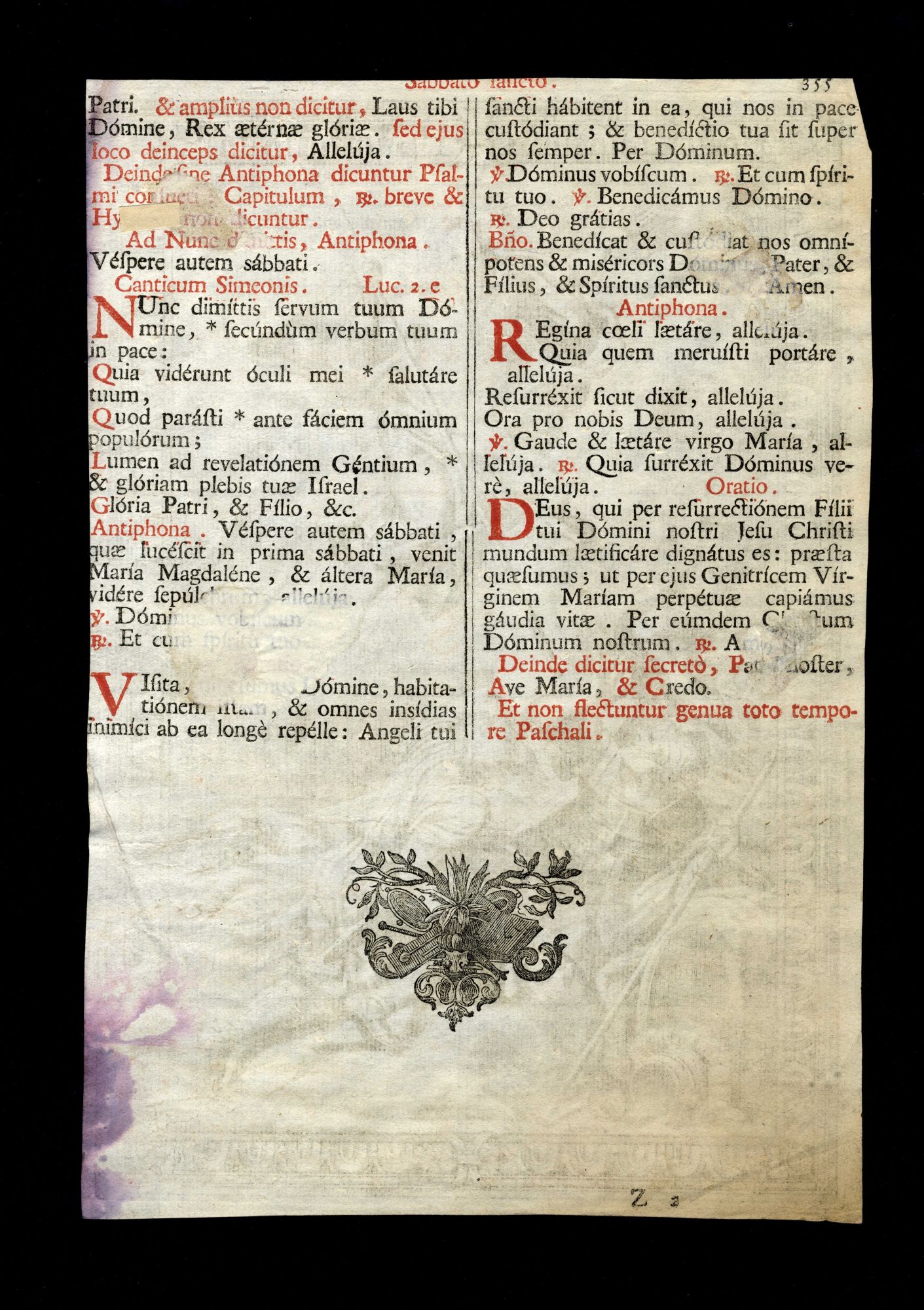 Incisioni tratte da un messale, con il testo latino sul verso. Piccoli margini oltre alla battuta della lastra, in generale in buone condizioni salvo delle macchie sui margini.