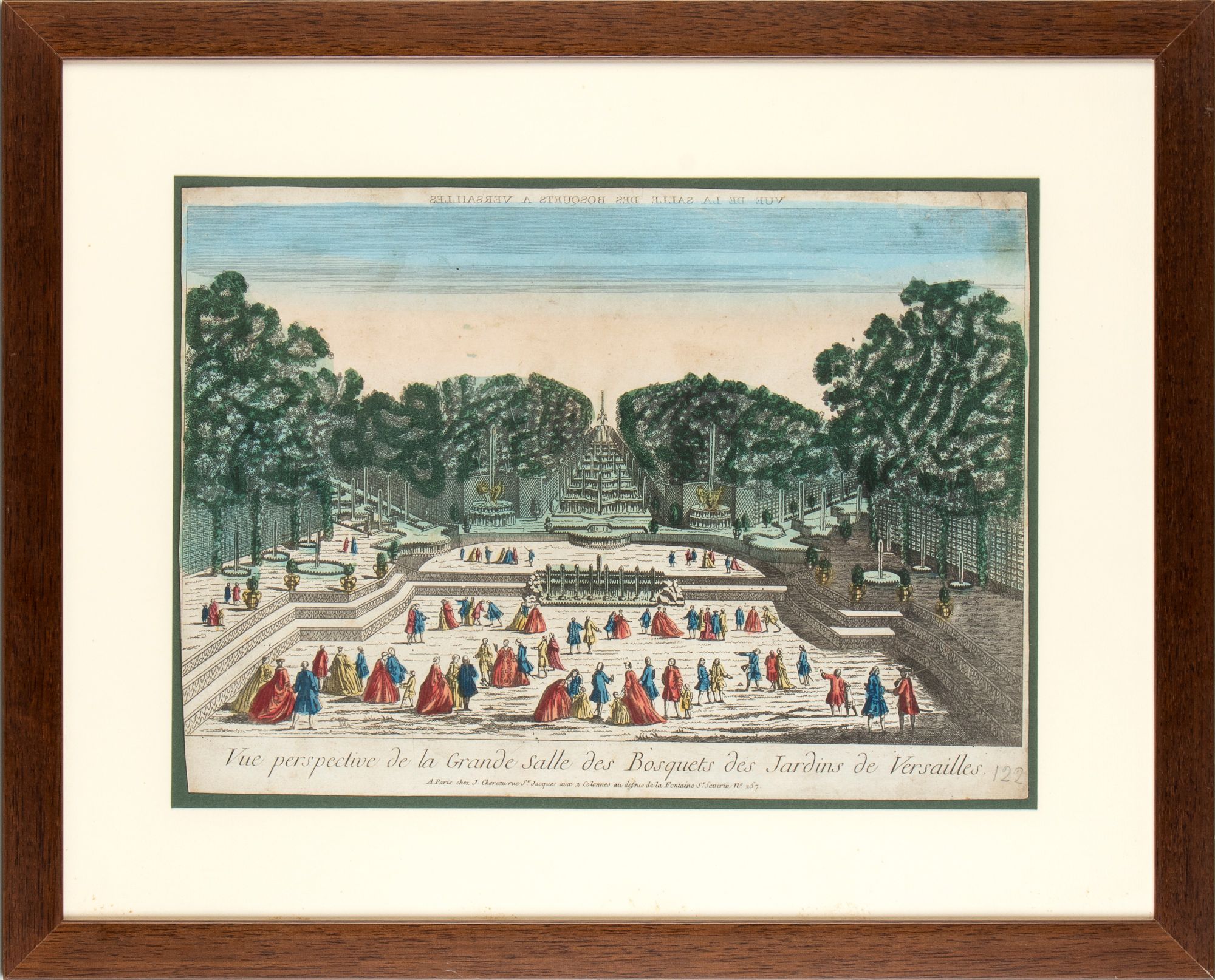 Acquaforte e bulino, 300 x 418 mm ca. Veduta ottica, vue optique, dei giardini di Versailles, con l'indirizzo di Jacques Chéreau presso Rue Saint-Jacques aux 2 Colonnes.