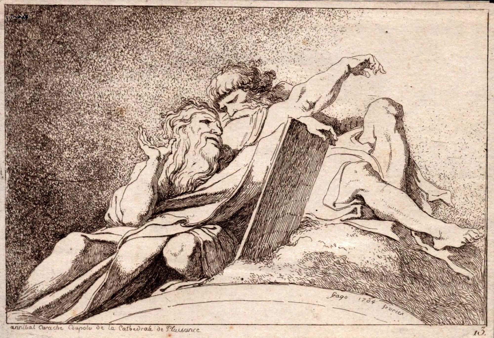 Da un dipinto di Carracci per la volta del coro della cattedrale di Piacenza. Acquaforte, 93 x 135 mm.