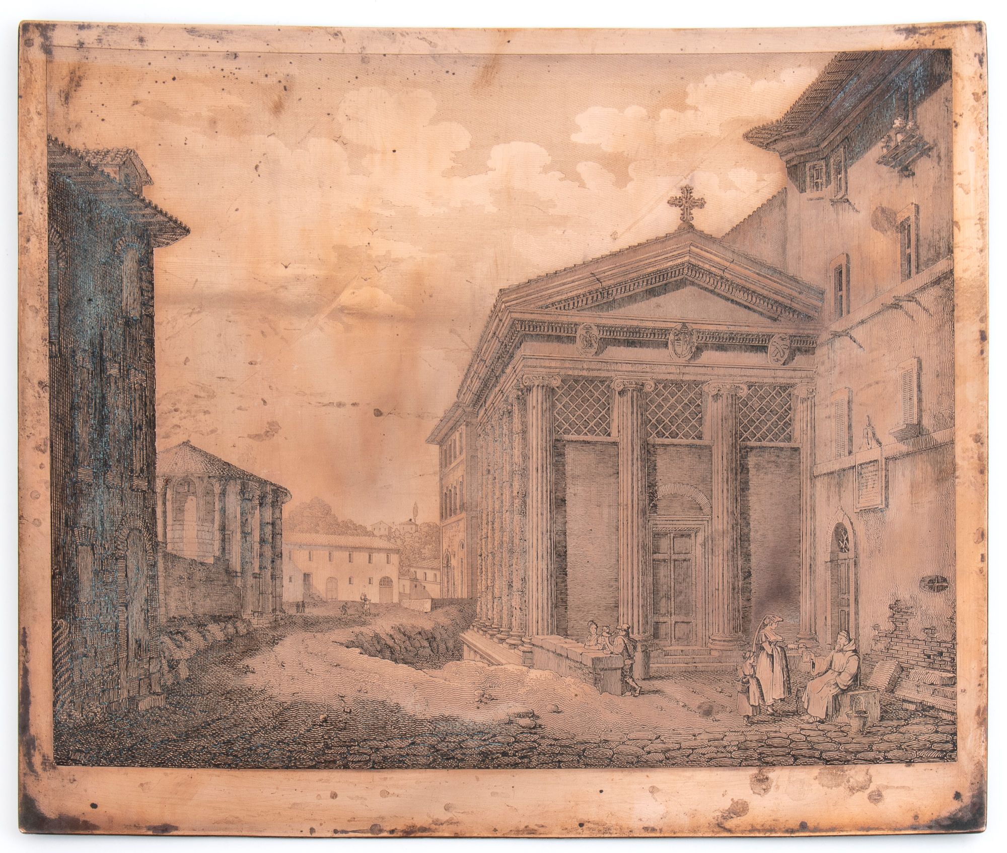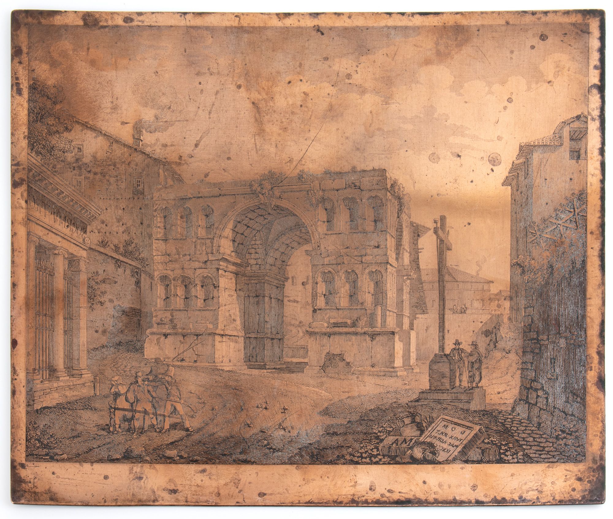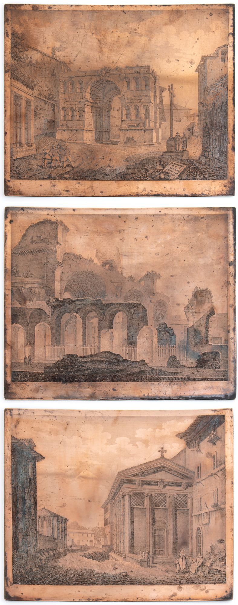 Tre lastre in rame, 30 x 36 cm ca. cad., raffiguranti Foro Boario, Arco di Giano (datata 1821) e la Basilica di Massenzio.