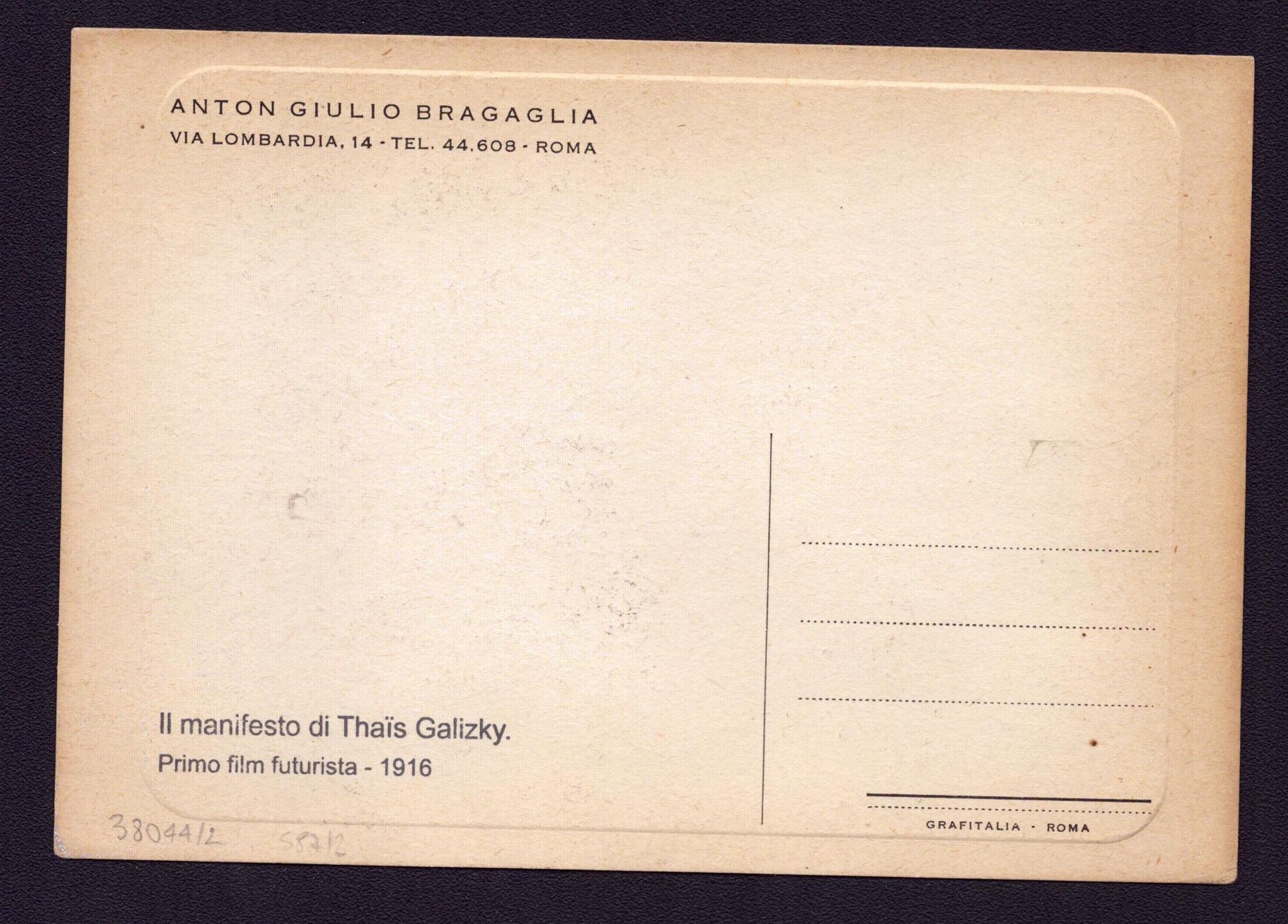 Cartolina postale futurista. Cromolitografia, 150 x 105 mm (foglio). Sul verso l'indirizzo di Anton Giulio Bragaglia.