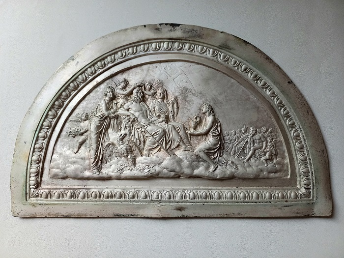 Giuseppe Ferraris (Attr.) - Lunetta in metallo argentato e sbalzato raffigurante Giove incoronato dalle Ore cm.15x26 in cornice