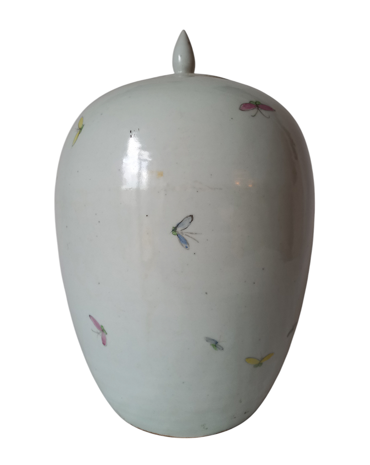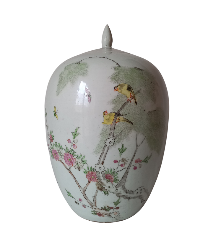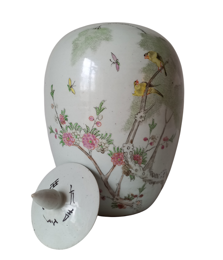 Potiche in ceramica decorata in policromia con volatili, farfalle e rami fioriti e scritte sul coperchio - Cina - h.cm.33