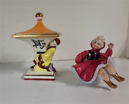 Manifatture Dupoma e Girardi - Vaso policromo con coperchio in maiolica e figura policroma in maiolica (restauro) h.max.cm.23